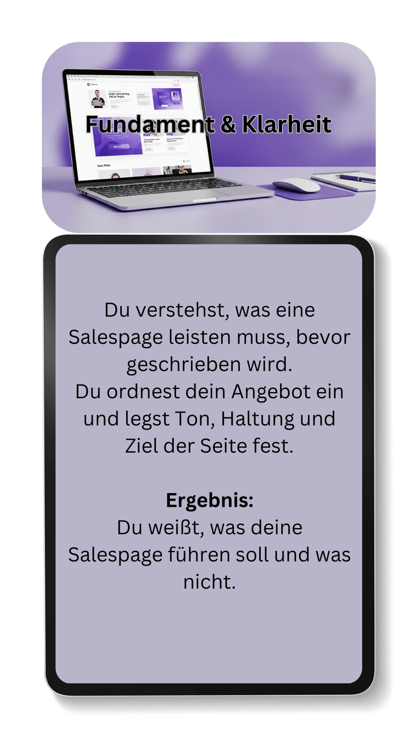 Am Ende hast du eine komplett fertige Salespage mit allen Texten, die ruhig wirkt und trotzdem verkauft.