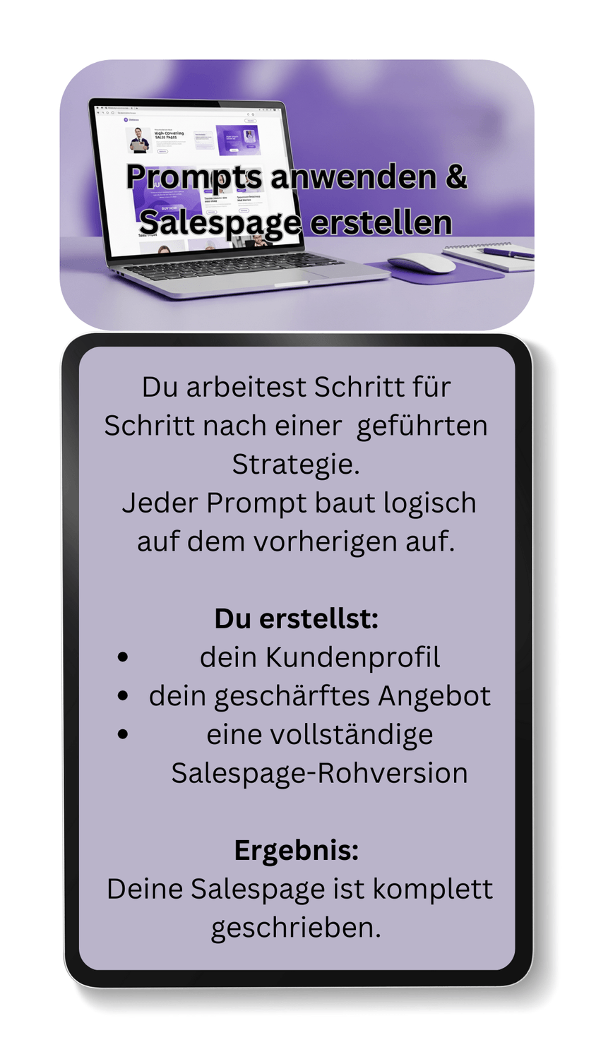 Du bekommst die vollständige Strategie, wie eine verkaufsstarke Salespage entsteht – inklusive hochspezialisierter Prompts, die dich Schritt für Schritt zur fertigen Seite führen. Klar strukturiert, logisch aufgebaut und ohne Rätselraten.