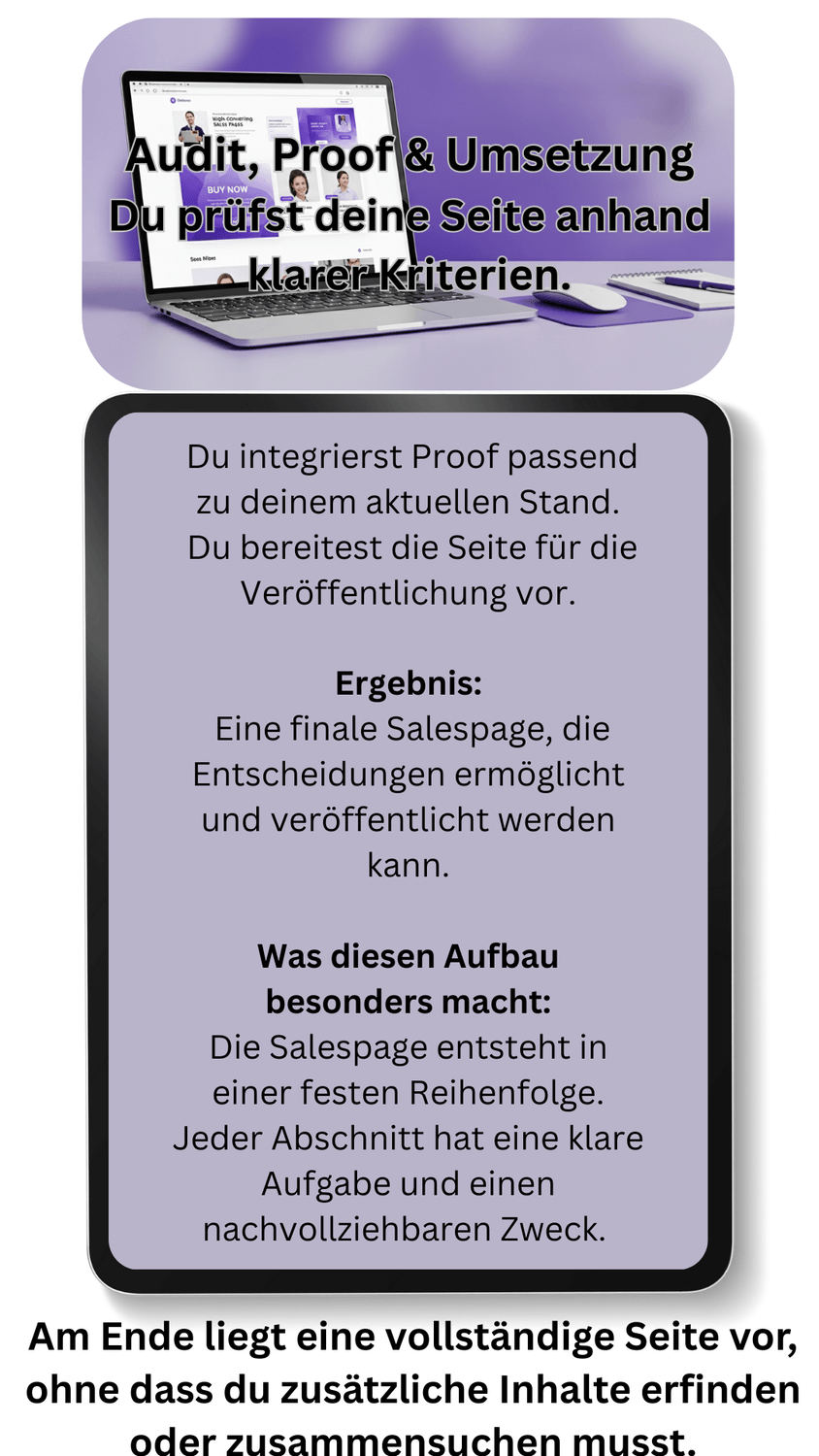 Ein klares System, mit dem du deine Salespage gezielt optimierst und Vertrauen aufbaust – auch ohne Testimonials. Du weißt genau, was geschärft, gekürzt oder ergänzt werden muss, damit deine Seite kaufbereit wird.